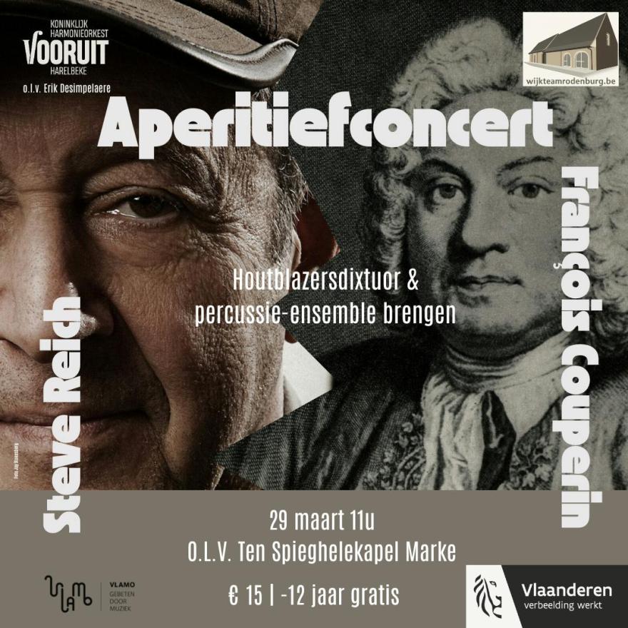 We brengen met een houtblazers dixtuor en slagwerkensemble werk samen van François Couperin, Franse zeventiende-eeuwse barokke componist, en Steve Reich, hedendaags schrijver van minimalistische muziek. Een unieke combinatie! Op een unieke locatie: de kapel van O.L.V. Ten Spieghele in Marke.