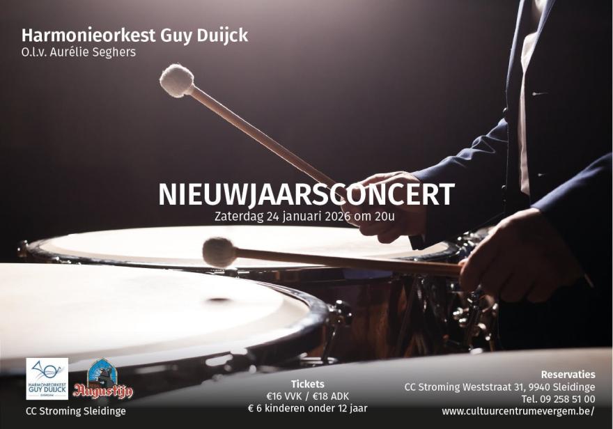 Naar jaarlijkse traditie viert Harmonieorkest Guy Duijck het nieuwe jaar in CC Stroming. Dit jaar niet op zondagvoormiddag, maar wel op zaterdagavond. Daarnaast nog meer vernieuwing: het nieuwjaarsconcert is dit jaar inclusief pauze, waarin u gezellig kunt bijpraten.