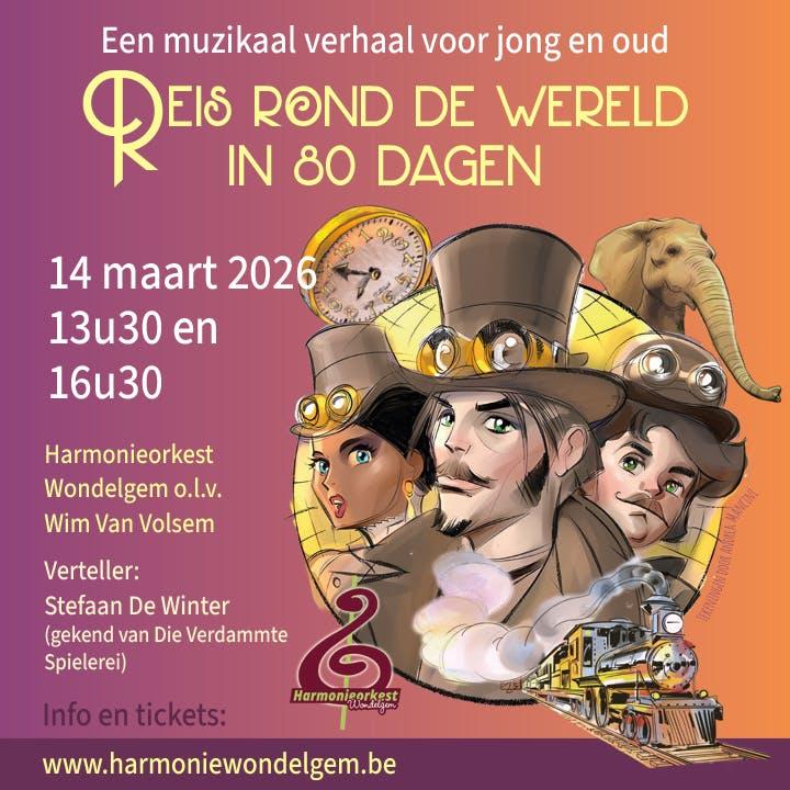 'Een reis rond de wereld in 80 dagen' - een wereldberoemde titel, maar ken je ook het verhaal? Phileas Fogg, een Britse avonturier, sluit een weddenschap af dat hij in 80 dagen de wereld rond kan reizen. In een tijd zonder vliegtuigen, smartphones of hogesnelheidstreinen begint hij aan een avontuurlijke tocht per trein, stoomboot en zelfs per olifant. Dit verhaal wordt tot leven gewekt samen met de hilarische verteller Stefaan De Winter - in Gent en omstreken gekend van zijn saxofoongroup 'Die Verdammte Spielerei'. Het harmonieorkest wordt de soundtrack van dit beroemde verhaal. Woord, drama en muziek in een unieke voorstelling.