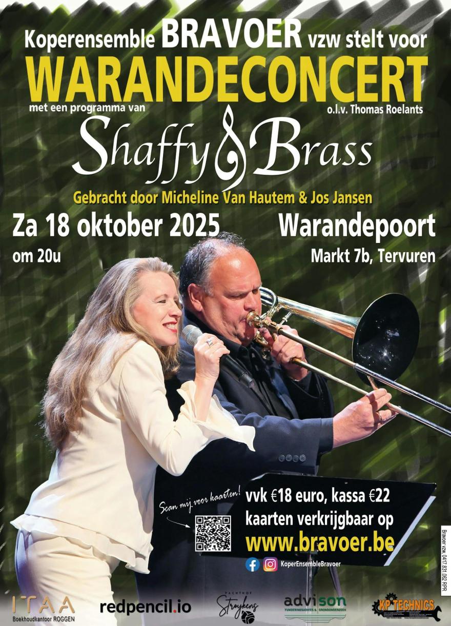Tervuren – Noteer zaterdag 18 oktober 2025 met stip in je agenda voor een bijzonder Warandeconcert van koperensemble Bravoer. Muzikale gast dit najaar is Micheline Van Hautem met het programma ‘Shaffy & Brass’. Dat is een ode aan Ramses Shaffy, een van de meest invloedrijke Nederlandse chansonniers van de vorige eeuw. Een parel van een concert voor alle liefhebbers van warme koperklanken, uitmuntende zang, én van Ramses Shaffy. Warandeconcert op zaterdag 18 oktober 2025 om 20u00 in De Warandepoort in Tervuren.