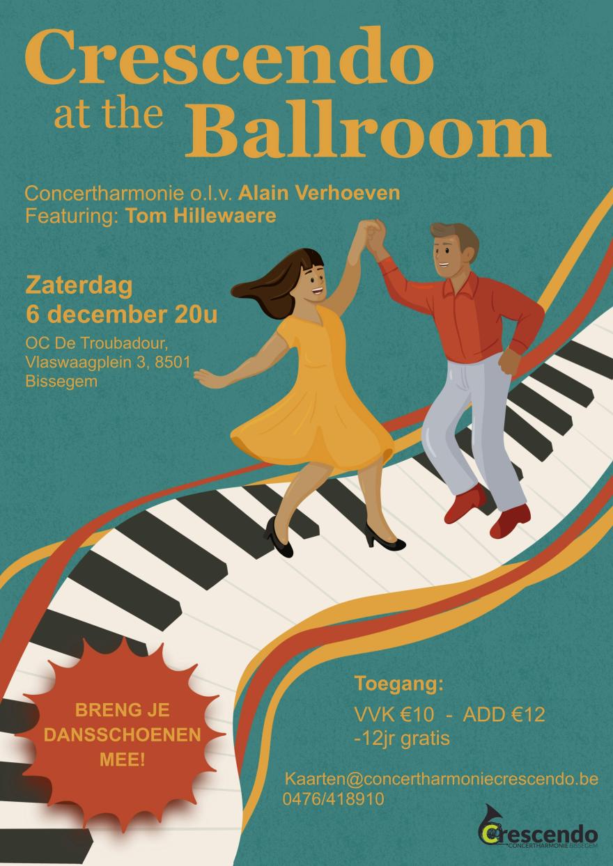 Ooit gedanst op live muziek van een harmonieorkest ? Crescendo Bissegem nodigt alle muziek- en dansfanaten uit op de dansvloer. Of koppeldans, line dance - alle dansstijlen komen aan bod. Het groot balorkest en combo met zanger Tom Hillewaerezorgt voor non-stop dans- en luisterplezier. Geschikt voor jong en oud, geoefende dansers en pure liefhebbers.
