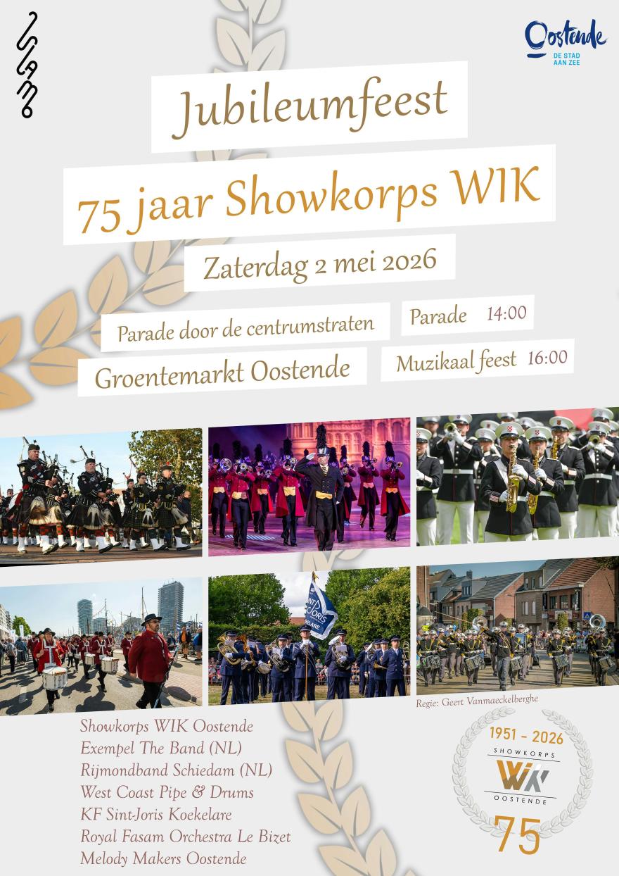 Aanleiding voor dit unieke evenement is het 75-jarig bestaan van Showkorps WIK Oostende. Wat in 1951 begon als een bescheiden trommelkliek groeide uit tot een toonaangevend showkorps en muzikale ambassadeur van Oostende, met meer dan 1.400 optredens in binnen- en buitenland. Dat rijke verleden én de bruisende toekomst worden gevierd zoals het hoort: samen met het publiek, in open lucht, zonder ticket, en met muzikale vrienden van het hoogste niveau.