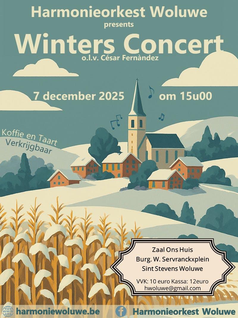 Het Harmonieorkest Woluwe speelt met 40 muzikanten winterse muziek in een warme zaal. Het gezelligste concert van de regio, waar ook koffie en taart geserveerd wordt. Op het programma: klassieke harmoniemuziek, filmmuziek en kerstmuziek.